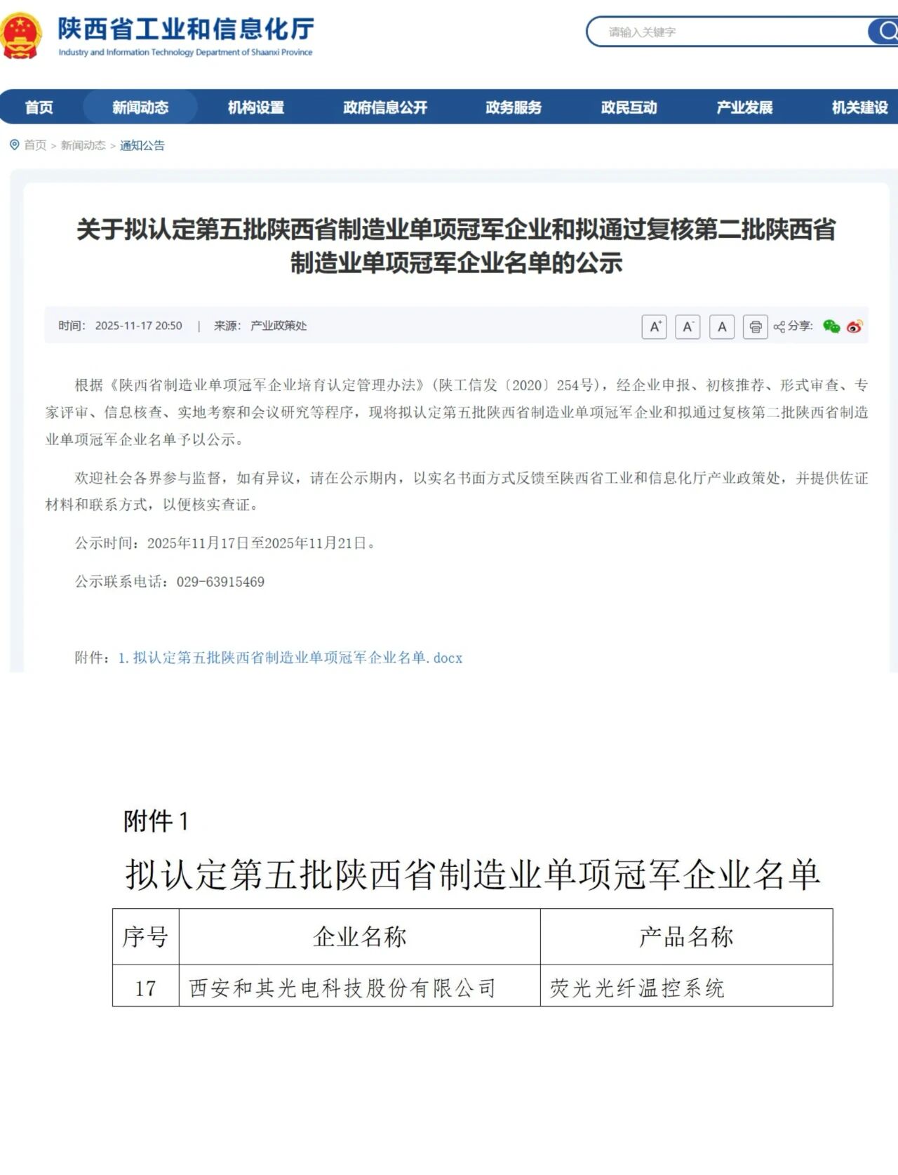 近日,陕西省工业和信息化厅公布了2025年陕西省制造业单项冠军企业名单,西安和其光电科技股份有限公司凭借核心产品“荧光光纤温控系统"成功入选!这是继公司获得国家级专精特新重点“小巨人”等荣誉后,在制造业领域获得的又一重要权威认定!
