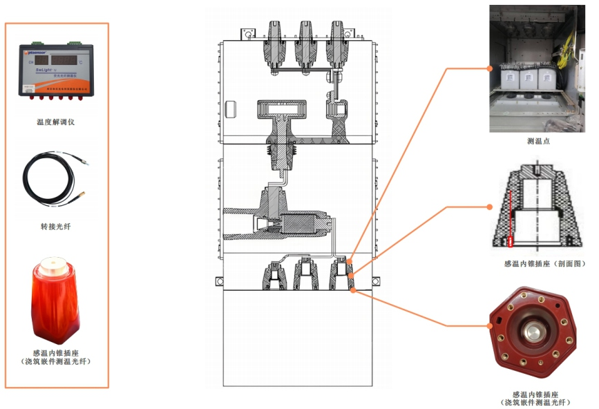 HQ-E13 充气柜荧光光纤测温系统,是将测温光纤直接浇注在电缆终端附件内锥插座内部,并通过转接光纤连接温度解调仪实现测温。在充气柜中安装方便,可实现实时监测及预警电缆接头的温度。可避免设备短路引起的重大事故。