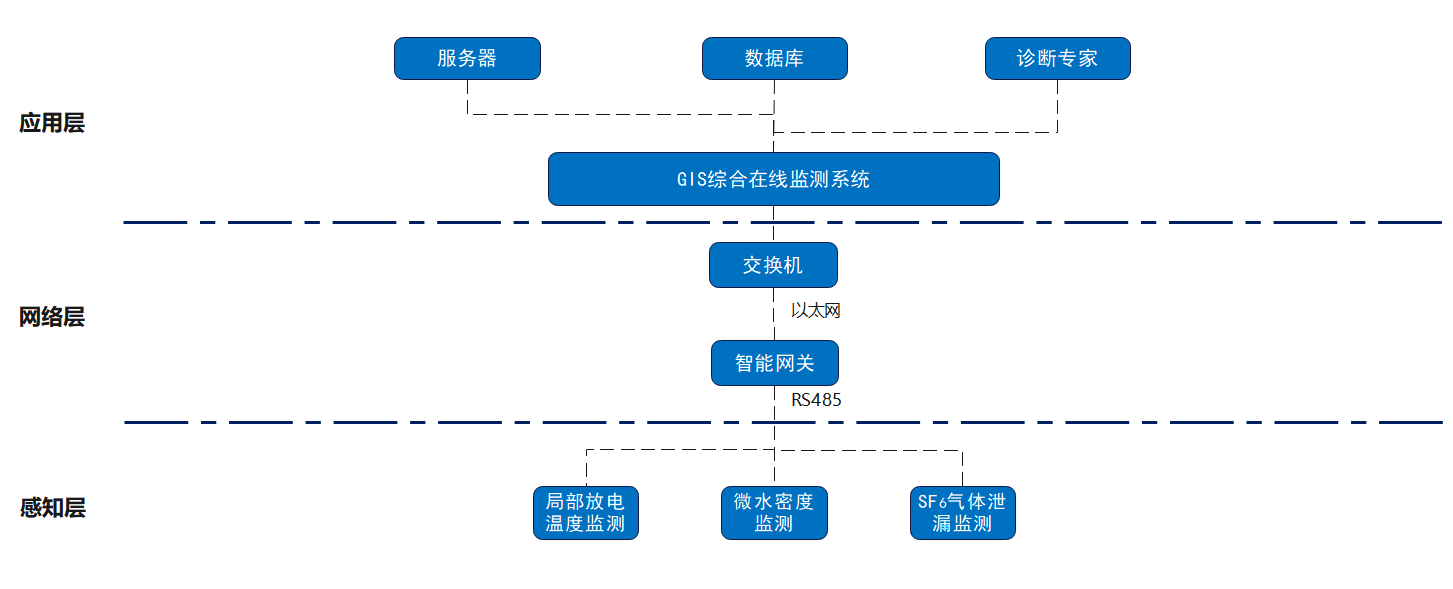 GIS组合电器智能综合在线监测系统方案主要由设备端的各种智能化传感器和在线监测与故障诊断分析平台组成。也可以扩展成“云、边、端”应用体系。
