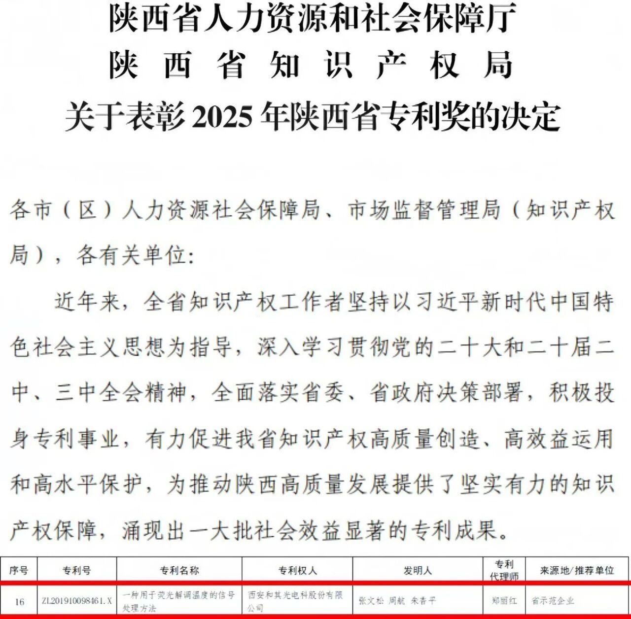 近日,陕西省知识产权局公布了2025年陕西省专利奖的名单,和其光电的《一种用于荧光解调温度的信号处理方法》,凭借突出的技术创新性、高效的产业应用价值,成功荣获陕西省专利优秀奖!